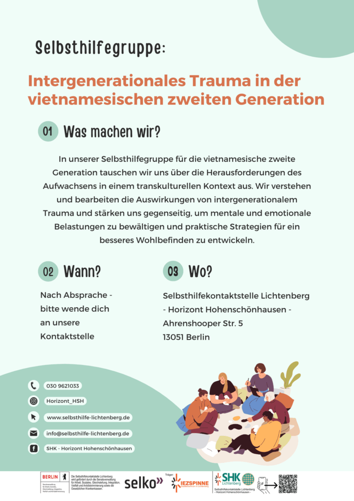 Eine neue Selbsthilfegruppe von der zweiten vietnamesischen Generation, die sich über das Aufwachsen im transkulturellen Kontext austauscht, hat sich gegründet. Treffen findet in der Selbsthilfekontaktstelle Lichtenberg in der Ahrenshooper Straße 5 statt. Kontakt: info@selbsthilfe-lichtenberg.de