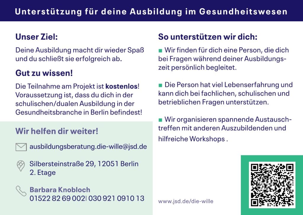 Tel.: +49 30 / 92 10 91 013 und +49 152-28 26 90 02 | E-Mail: ausbildungsberatung.die-wille@jsd.de
