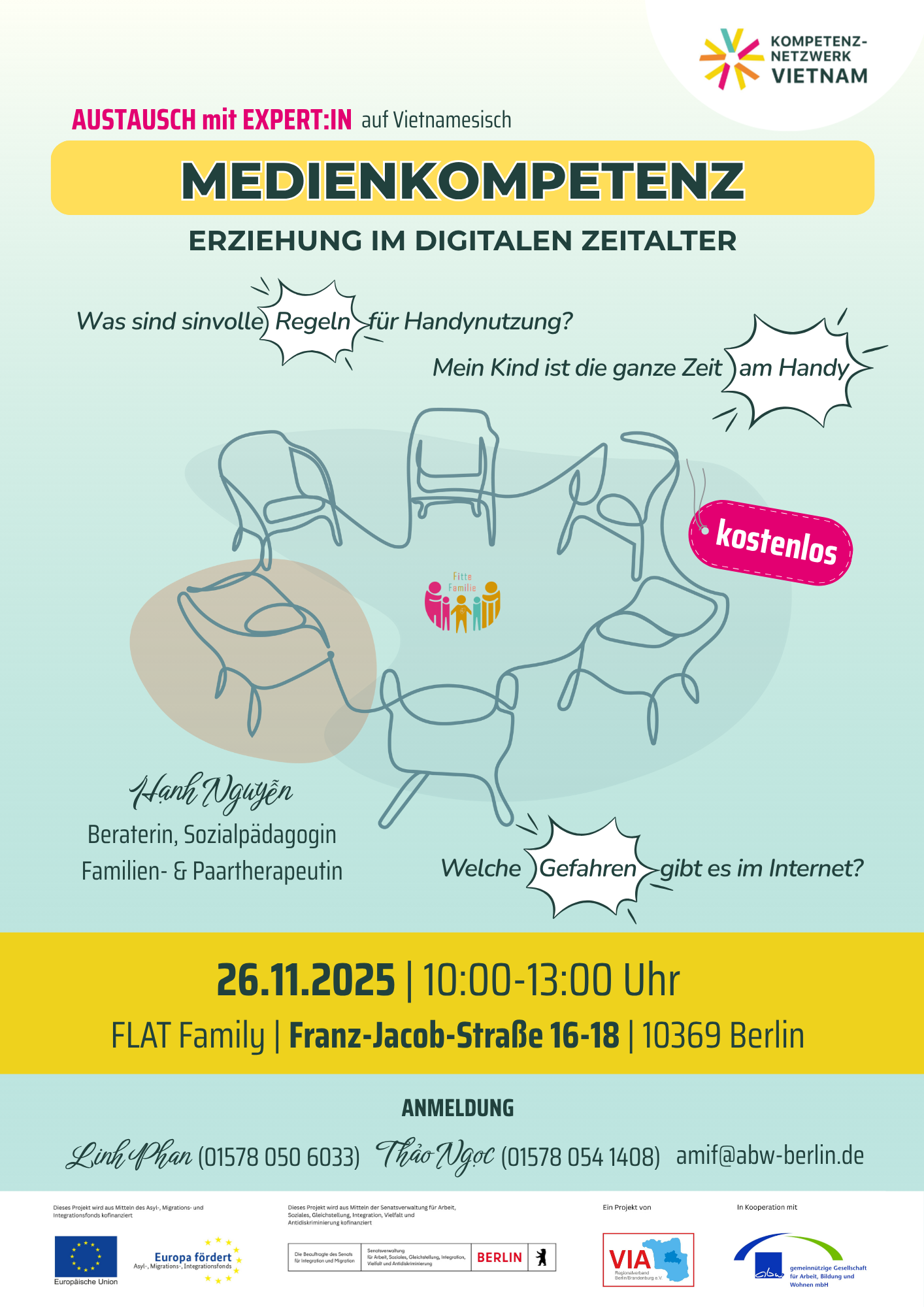 Die kommende Veranstaltung zum Theme Medienkompetenz richtet sich an vietnamesischsprachige Eltern, Fachkräfte und alle Interessierte und wird gemeinsam mit dem Projekt Fitte Familie durchgeführt.